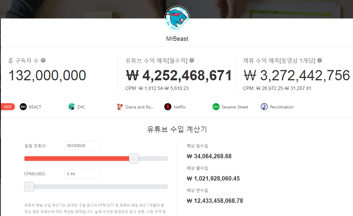 혹시 더 궁금하신 채널이 있으면 네이버에서 유튜브 이름 + 수익 계산기라고