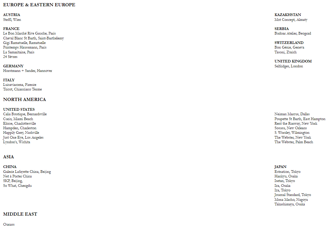 홈페이지 들어가서 찾아보니 다른 나라에서도 판매가 되고 있는 것 같은데요. 제가 몇 군데 찾아본 바로는 검색이 안되네요. 아마도 단독매장 형태로 입점한 게 아니라 편집샵에 들어가지 않았나 싶습니다.