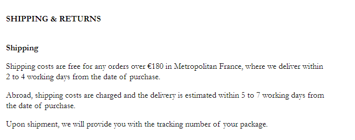 아래 내용에 근거하면, 해외 배송도 진행하고 있는 것 같아요. 프랑스 안에서 180유로 이상 구입하면 무료 배송 해주고 있고, 기타 국가는 실제 비용만큼 청구하고 있는 것 같습니다.