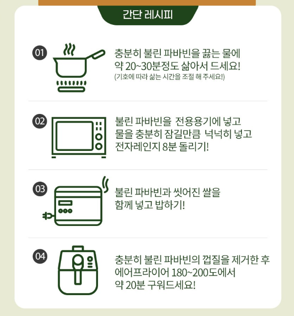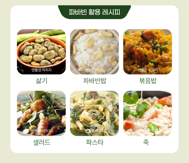 굽기: 파바빈은 바삭바삭한 간식처럼 먹을 수 있는데요. 약간의 기름, 소금, 그리고 향신료와 함께 오븐에서 구워드시면 됩니다.