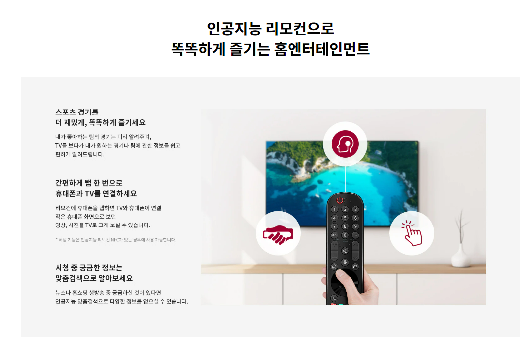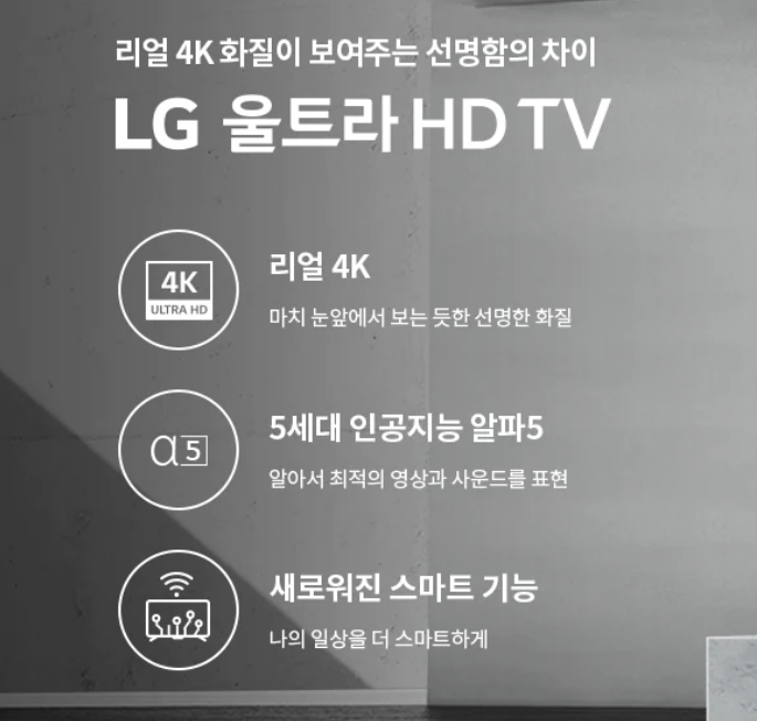 이 티비는 나노셀 기술과 IPS 패널을 적용해서 기존 LCD TV 대비 색 재현율을 높였고, 넓은 시야각을 제공한다고 합니다. 또한 4K UHD 해상도로 FHD 보다 4배나 선명한 화질을 자랑하며, 하만카돈 기반의 사운드 시스템을 장착했다고 하네요. 특히 눈에 띄는 점은 인공지능 ThinQ 가 지원된다는 점이에요. 음성인식기능 뿐만 아니라 홈보드/리모컨 찾기 등 다양한 편의기능들을 이용할 수 있다고 해요.