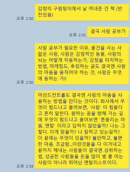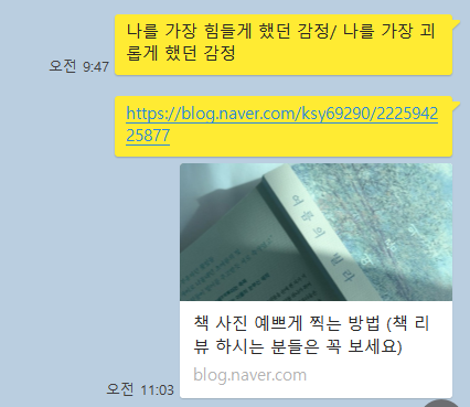 그럴 때는 참지 못하고 카카오톡을 메모장 삼아 떠오르는 생각들을 글로 남긴다.
